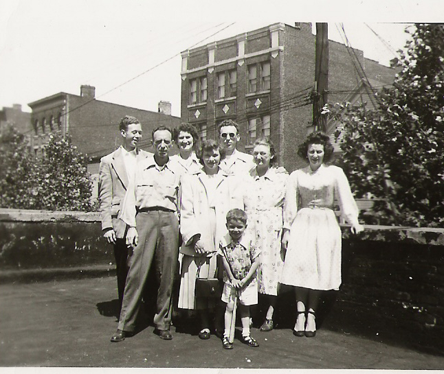Three generations of the Doran family are standing on the roof of their apartment on the corner of Ferry and Jackson streets, Down Neck, Newark, New Jersey, about 1949. Standing in the back are Billy, Mary & James (sporting the cool sunglasses). In front of them are Bernie, Betty, Mary “Mamie” Mahoney Doran (1895-1961), and Margaret. Holding the bat is my cousin, ready to play ball.