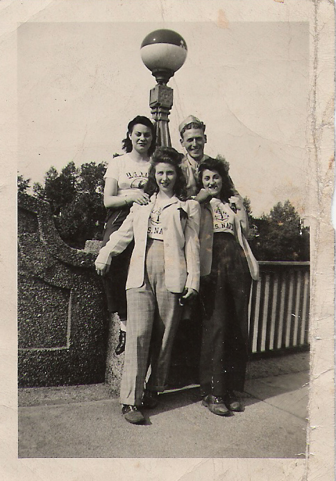 Kearny is the next town up from Harrison, NJ, where the Doran family were living at that time. Margaret and her girlfriends worked in the local factories for the war effort. They were part of a new liberated generation of women, like “Rosie the Riveter” that replaced the men in the factories during the war years. I love their fashion look with the matching Navy shirts, crisply creased slacks, and fitted blazers with ribbons pinned on the lapels, and neat shoes. Later Margaret would marry the love of her life, Walter “Fiddles” Sikora. Margie was always such a fun person to be around.