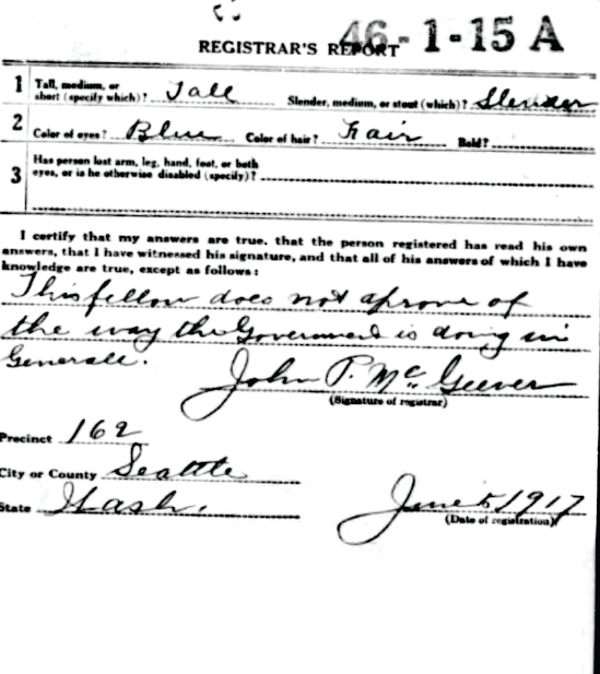 My husband’s great-uncle Leonard (1890 – 1969) registered for the draft in 1917, and for reasons only known to him, felt compelled at the time to inform the Registrar of his opinions. The Registrar’s notation on the draft card reads: “This fellow does not approve of the way the Government is doing in general.” I can only imagine what else he might have said! And I wonder what he thought as he grew older and saw his son and nephews register for the draft in WWII, and later on saw more boys register for the Korean War and then the Vietnam War during his lifetime? Did his opinions change? Some how, I don’t think so. This short notation hand-written on a registration card makes this man, whom I never met, real to me.
