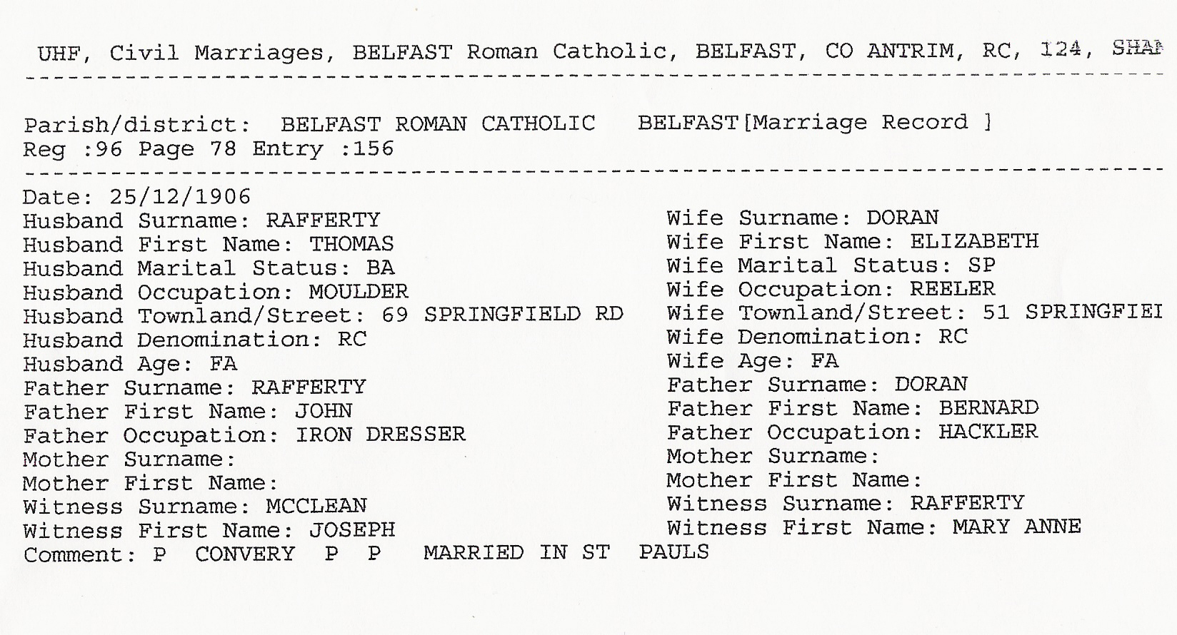 By the time of the 1901 Irish Census, Elizabeth was fourteen and working as a flax reeler at one of the nearby mills. On 25 December 1906 she married Thomas Joseph Rafferty at St. Paul’s R. C. Church, Lower Falls Road. Maybe it was a custom to marry on Christmas Day back then.
