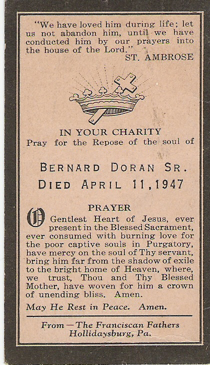 Surviving are his wife, Mrs. Mary Mahoney Doran; two daughters, Misses Margaret and Elizabeth, and five sons, Bernard Jr., James, Peter, William and Joseph, all at home.”