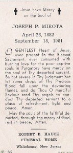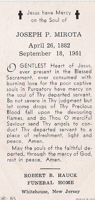 “Joseph P. Mirota Sr., 79, of Mountain road, Whitehouse, died suddenly at the home of his daughter, on Monday afternoon.