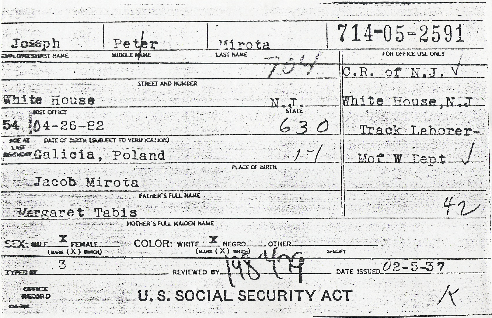 If you click on the record below it will open up in a larger format. Here, Joseph Mirota is listed as working for the C. R. of N.J., or the Central Railroad of New Jersey, later called the Jersey Central Railroad, and still in existence today as the Raritan Vally Line for New Jersey Transit. He was a lineman working as a laborer in all kinds of weather. Many a snowy night he had to go out to clear the tracks for the trains to be able to run. It was a very dangerous job, and after reading old issues of the Whitehouse Review from his hometown I can vouch for that. There were many injuries and deaths recorded in the newspaper.