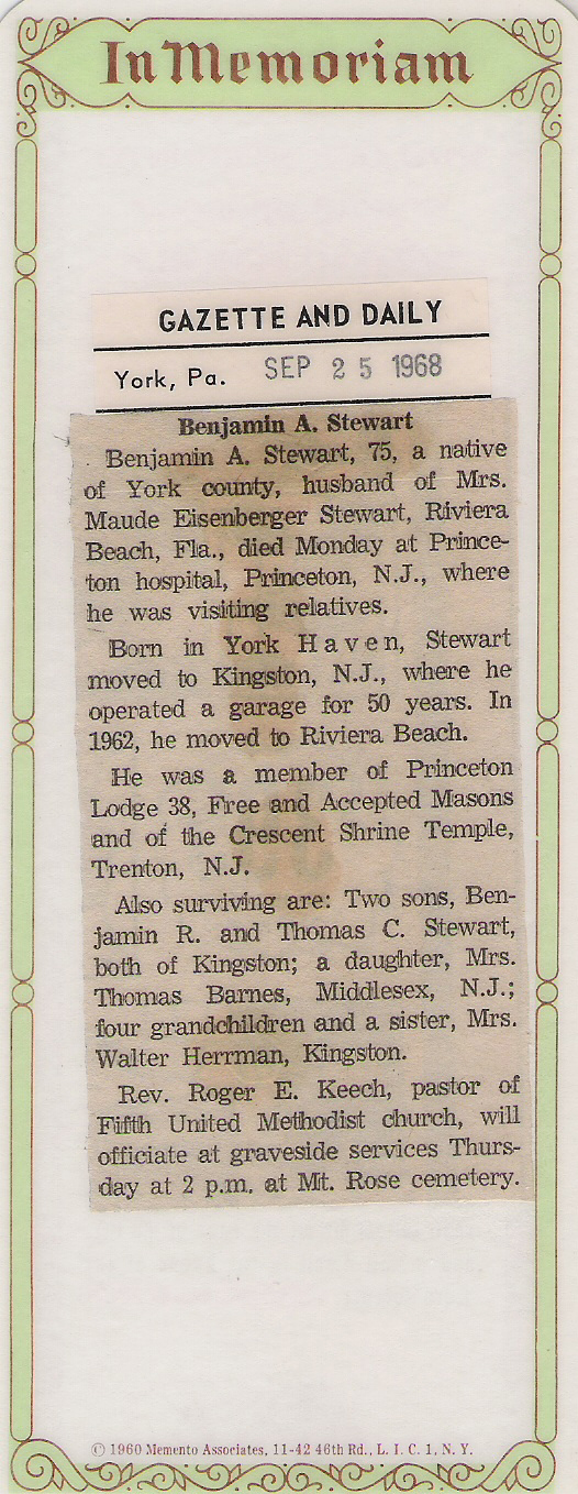 Below is a photograph of Benjamin and Maude Eisenberger Stewart, that was most likely taken on their wedding day in York City, York County, PA on 1 December 1916. The obituary above, that was laminated and saved by the family, could have been given to Maude by the funeral home of A. S. Cole Son & Co., in Cranbury, NJ since they took care of all arrangements. Many other interests and activities that Ben Stewart followed were not included in the obituary. Ben was an avid fisherman and boater, and when he retired to Florida he supplemented his income with selling fish he caught, like pompano, to local markets. Also, he was a member of Kingston’s Volunteer Fire Company # 1, and one of the founding group in 1924, and when the first fire truck was delivered that year, he agreed to provide a place for it at his Kingston Garage.