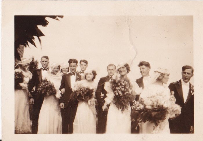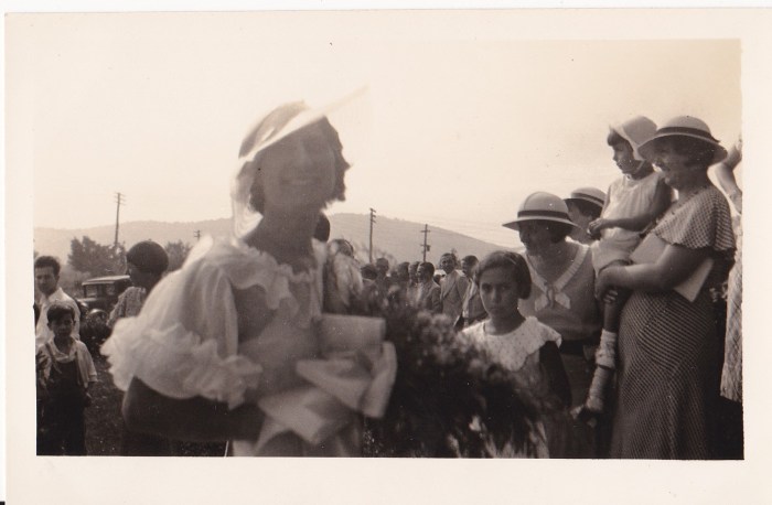 And yes, during the Depression years there were wedding crashers, too. Jennie wrote that the invitations were taken at the door to the reception hall, and lots of people had to stay out, since they were strangers! I love the hats the women are wearing, and the little boy in the overalls. Behind Mary Mirota you can see the crowds milling about.