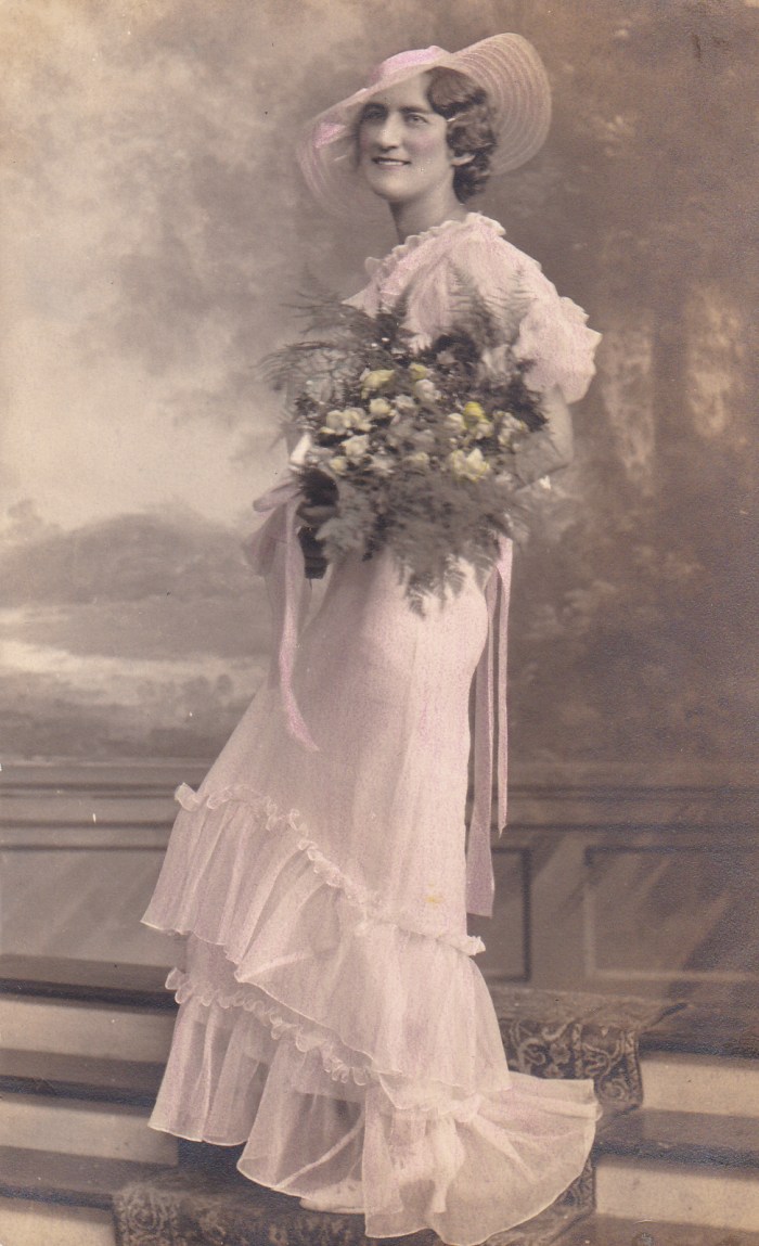 Her sister, Mary Mirota, looked stunning also, dressed in soft pink with a pink hat and sash, and she carried a bouquet of tea roses.