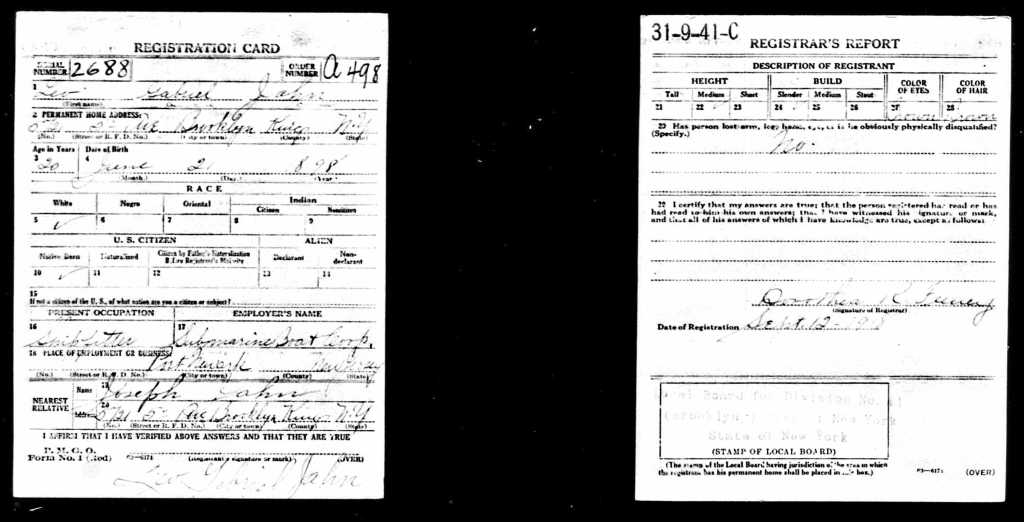 A few months later, September 1918, Leo followed in his brother Fred’s footsteps and registered for the WWI Draft. Both boys were living at 5721 5th Avenue, Brooklyn. The second page of the draft registration describes Leo as physically slender, medium build, brown hair, and brown eyes.