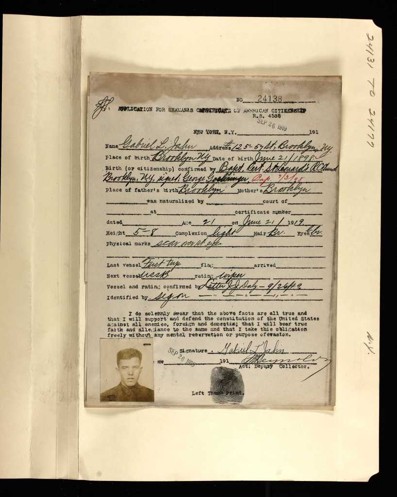 Gabriel L. Jahn of 125 5th St., Brooklyn, NY. is described on the application as being 5’8 ”, light complexion, brown hair, brown eyes, with a scar over his right eye.