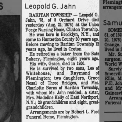 Leo and Grace Jahn are buried at St. Magdalen’s Roman Catholic Cemetery, Flemington, NJ.