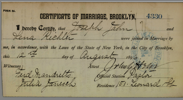 Less than a year after his arrival in the US, Joseph Jahn married Maria Magdelena Richter (aka “Lina Richter”) in Brooklyn, Kings County. New York. She had already been living there for at least 8 years. They were married on the 12th of August, 1896. Their Marriage Record #M-K-1896-4330 indicates they were both living at 310 Central Avenue, Brooklyn, NY. This is the Bushwick neighborhood. He was 23 and she was 25. Neither had been previously married. Both state they were born in Germany. His occupation was noted as Confectioner. His parents’ names were abbreviated on the certificate as Fred. Jahn and Magd. Schenbel. Her parents’ names were Gabriel Richter and Anna Erlwein. The witnesses were Fred Mandretts and Julia Janesch. The name of the pastor/priest is unreadable (by this writer.) The address for the pastor was 151 Leonard St., Brooklyn, NY.