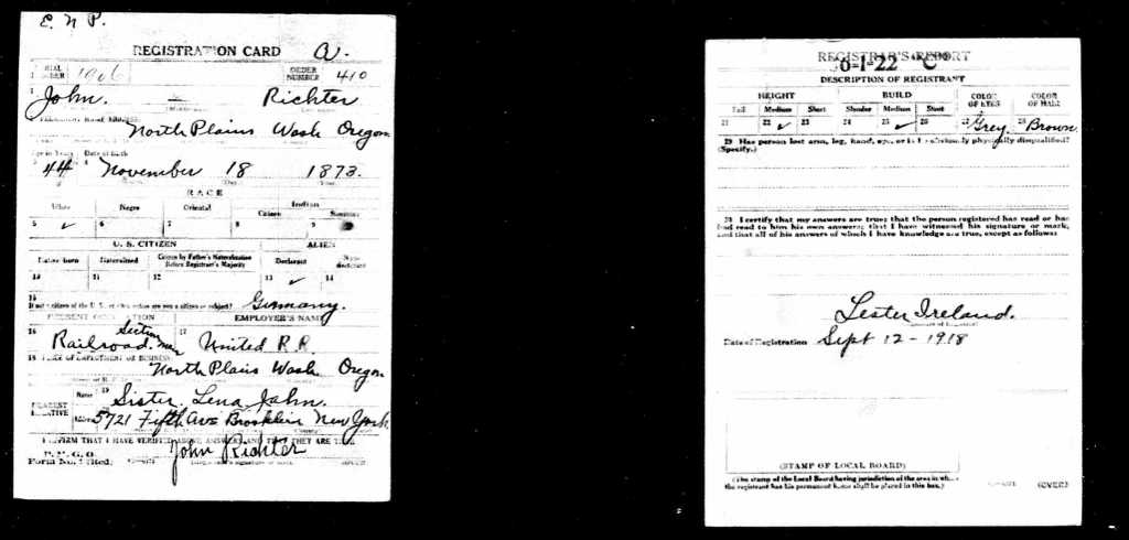 John Richter did not stay in New York, as Lena might have hoped. It’s not clear when he left, but John moved out West. In 1917-1918 he was living in North Plains, Washington Co., Oregon, which is part of the Portland-Vancouver Metropolitan area. John never married. On his WWI Draft Registration in 1918 John listed Lena Jahn of 5721 5th Ave., Brooklyn, NY as his next of kin. He may not have been aware that Lena had died in 1917 or maybe didn’t remember Joseph’s name so he just used Lena’s.